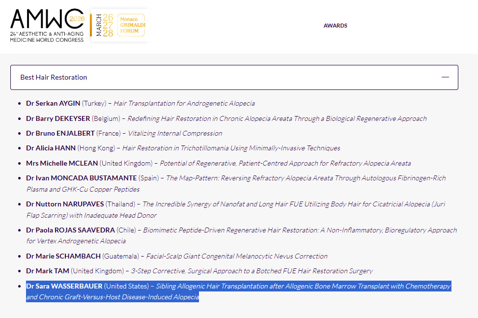 Dr. Sara Wasserbauer has been named a finalist for the prestigious “Best Hair Restoration Surgery” award at the Annual Aesthetic & Anti-Aging Medicine World Congress (AMWC) in Monaco.