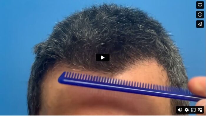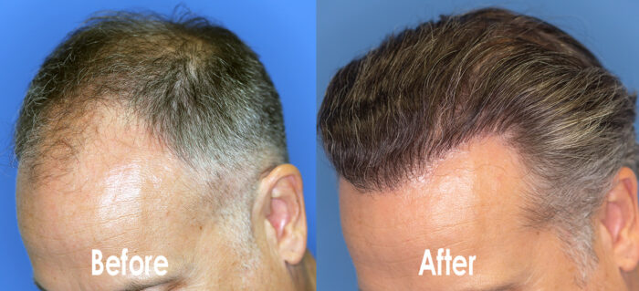 This patient underwent two FUT linear strip harvest procedures to reestablish his hairline and temporal region, and to fill in his crown. The first procedure involved transplanting 3073 grafts. The second surgery was performed 3 years later, transplanting 1643 grafts to add more density to the frontal region. Crown, filled in on the first procedure…